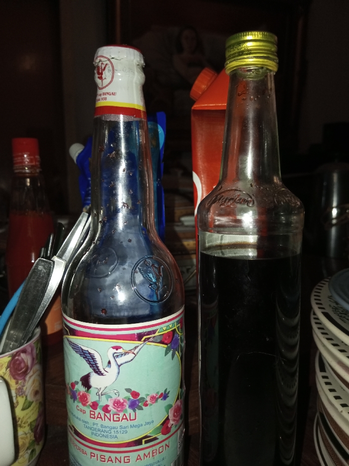 The scene is set indoors in Melakudikadu, India, under dim lighting. The foreground features a collection of domestic items resting on a dark, flat surface. A white ceramic mug with a floral pattern of pink roses and green leaves is positioned on the left, holding several metal utensils, including spoons and knives. To its right stands a clear glass bottle, approximately three-quarters full with a dark, purplish liquid. Its neck is sealed with a crumpled white, red, and yellow foil cap. The bottle's lower half bears a label depicting a white heron or crane flying over pink and purple flowers, with "Cap BANGAU" prominently displayed, along with "PT. Bangau Sari Mega Jaya Tangerang 15129 INDONESIA" and "PISANG AMBON." An embossed floral design is visible on the bottle's shoulder. To the right of the first bottle, a second clear glass bottle with a gold-colored screw cap contains a dark, opaque liquid, filling approximately two-thirds of its volume. The name "Mariam" is embossed on its shoulder. In the mid-ground, a partially visible red bottle with a red cap containing a red liquid is to the left, behind the utensil holder. Behind the prominent left bottle, a blue container is partially visible. Between and behind the two main bottles, an orange carton with an orange cap and a partial white circular logo is present. To the far right, a stack of white and brown patterned plates is visible. The background is dark and indistinct, with a faint framed image or painting depicting a person, possibly a woman, discernible. There are no explicit actions or interactions depicted.