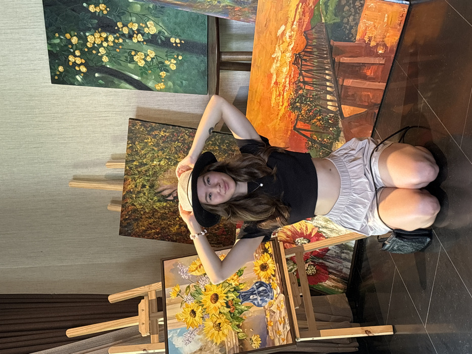 A young female kneels centrally on a dark tiled floor within an art gallery or studio in Nha Trang, Vietnam. She faces forward, smiling slightly, wearing a black crop top, light-colored pleated shorts, and a straw hat with a black band, held by both hands raised to her head. Her long brown hair frames her face. A small black cross-body bag rests on the floor beside her left knee. Multiple artworks are displayed around her. To her immediate left, on a wooden easel, is a vibrant oil painting of yellow sunflowers in a blue vase. Behind her, a large painting features abstract green and yellow foliage on an easel. To her right, a vertical painting depicts a tree with yellow blossoms against a dark green background, and a horizontal landscape painting of a bridge under an orange sunset sky leans against the wall. The background consists of light-colored, possibly textured walls and brown curtains on the far left.