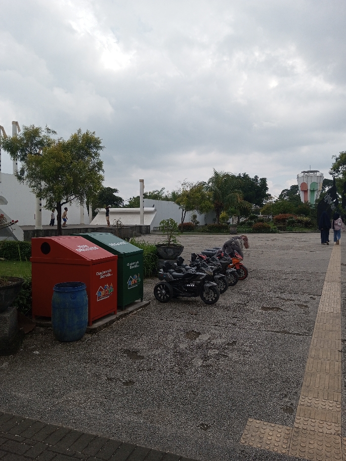 The image displays an outdoor public area in Daringbadi, India, under an overcast sky with light grey clouds. The foreground consists of a grey asphalt or gravel surface, with a beige pedestrian path featuring tactile paving running along the right edge, turning inwards at the bottom right. On the left, a red and a green industrial-style waste bin are present. The red bin has text partially visible as "Daurah Bersih..." and a logo, while the green bin clearly displays "Jagalah Kebersihan" and "Daerah Bersih" in white text, along with a logo featuring a house and trees. A blue plastic barrel is positioned next to the red bin. In the midground, a white, multi-level concrete structure with visible vertical supports stands behind a mature green tree. Three individuals are visible on this structure: two younger individuals near the tree, one in a light shirt and dark pants, and another in a light shirt and shorts. A third individual, dressed in a dark top and light pants, stands further right on the structure, facing right. To the right of the waste bins, a line of six recreational ride-on vehicles, appearing as miniature motorcycles and ATVs, are parked on the asphalt. The closest three are dark-colored, followed by an orange vehicle, and two more dark ones. In the far midground on the right, two individuals are walking away from the viewer: one adult in dark attire and a child in a pink shirt and blue jeans. The background is dominated by lush green trees and foliage, above which a distinctive, multi-colored (white, orange, light green) water tower or observation tower with a rounded top is visible on the far right.