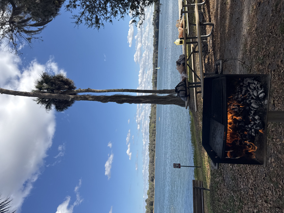 The scene depicts an outdoor recreational area at a lakefront location, presumably within Micanopy, United States, under a clear blue sky with scattered white cumulus clouds. In the immediate foreground, a black, square metal charcoal grill on a stand contains active flames and glowing embers beneath a grate that is partially covered by a flat griddle. The ground is covered with dried leaves. Slightly behind and to the right of the grill, a wooden picnic table with attached benches holds a grey duffel bag, several brown paper bags, and a yellow plastic container. Two tall, slender palm trees with visible fibrous trunks and hanging moss rise vertically behind the picnic table. Further dense green foliage is visible on the far right. To the left of the grill, a wooden park bench is situated near the water's edge, adjacent to a red and white sign on a post. The midground and background are dominated by a large, calm lake, featuring a distant, tree-lined shoreline. Several small white objects, including a sailboat with a white sail, are visible on the water's surface. No people are present in the image.