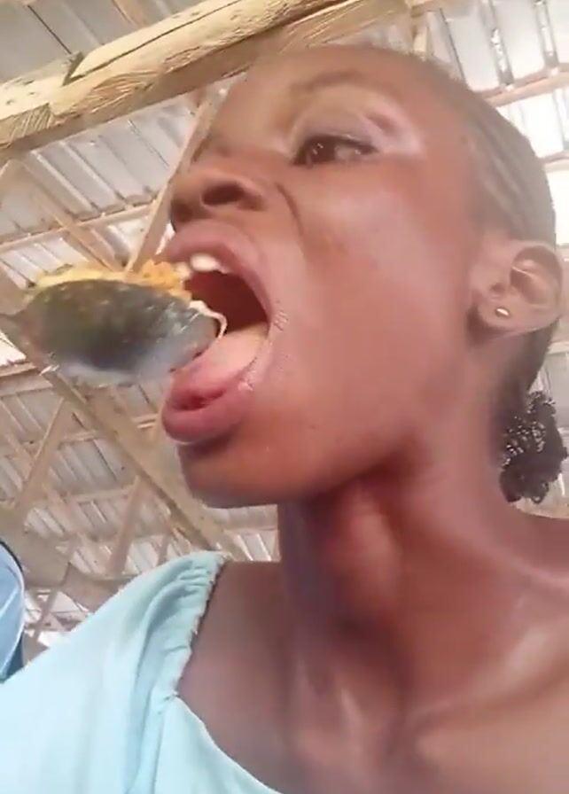 A medium shot shows a young woman indoors. The camera is held at an angle, looking up. She is wearing a light blue shirt with puff sleeves. She has short, dark hair in braids. Her skin is brown. The video shows her sticking her tongue out. In the background, other people are also eating. One is a young man with short hair, a blue shirt, and a black wristwatch. The background ceiling is made of wooden beams.