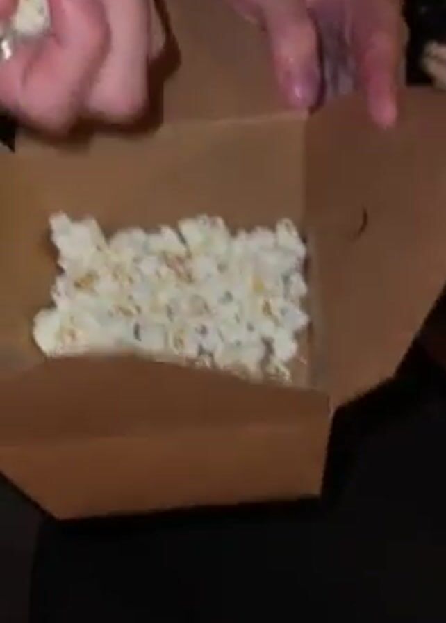 A young, fair-skinned woman with blonde hair and light blue eyes is shown in a close-up shot, holding popcorn in her hands from a small, brown cardboard box