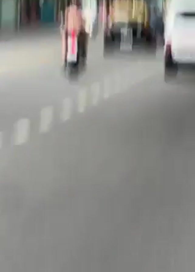 shirtless person riding a black moped down a tree-lined road with other vehicles