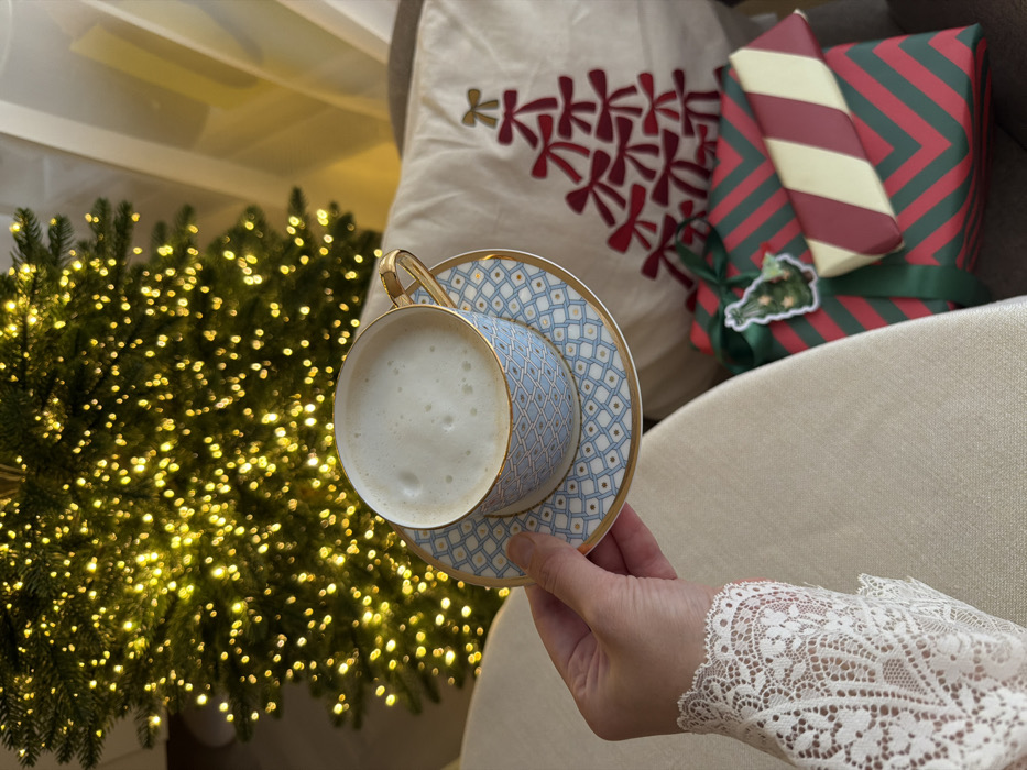 The scene depicts an indoor, festive environment in the city of Saint Petersburg, Russia. A light-skinned hand, adorned with a white lace cuff, holds a light blue ceramic teacup and matching saucer. The cup, with a golden rim and handle, contains a light-colored beverage topped with a layer of foam. Both the cup and saucer feature a pattern of light blue rhombuses and small golden squares. In the background, a green Christmas tree is illuminated by numerous warm-toned fairy lights, creating a blurred bokeh effect. To the right, a light-colored cushion or pillow is visible, embroidered with a stylized Christmas tree design composed of multiple red bows. Below the cushion, two wrapped gifts are present: one large gift wrapped in red and green striped paper with a green ribbon and a small Christmas tree-shaped tag, and a smaller gift wrapped in cream and red striped paper resting on top of it. The hand rests near a light-colored, possibly upholstered, surface. The overall lighting suggests ambient indoor illumination.
