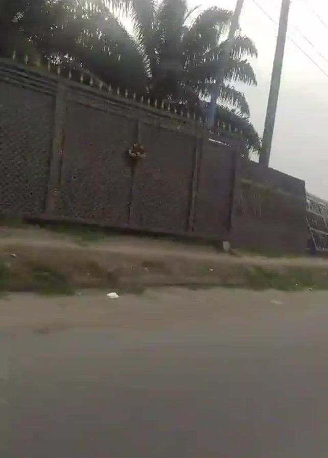moving shot from a vehicle traveling on a paved road. The focus is on the passenger side. A silver SUV is visible from the rear passenger door to the rear wheel, moving along the road. On the right side of the road, there's a long, dark-colored metal fence partially obscured by palm trees and utility poles with wires. The sky is overcast. The overall environment suggests a suburban or semi-rural area, potentially in a tropical region.