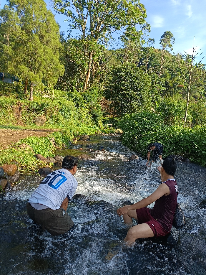 Three adult males are engaged in recreational activity within a shallow, rocky stream flowing through a densely vegetated, hilly area. The location is an unknown rural or semi-rural setting in Indonesia. In the foreground-left, an individual wearing a white short-sleeved shirt with blue "60 RYAN" text on the back and dark trousers is partially submerged in the water, bending forward, facing away from the camera. To the right, another individual is seated on rocks in the stream, wearing a maroon sleeveless top and maroon shorts, actively splashing water with his hands. Further in the background, a third individual, dressed in a dark t-shirt and dark trousers, is also partially submerged and bending forward, splashing water. The stream contains numerous visible rocks, and the water is turbulent around the individuals. The banks of the stream are covered with green grass, various bushes, and trees, with a dirt path visible on the left bank. The background consists of a steep, heavily wooded hillside with numerous tall trees under a bright blue sky with sparse clouds, indicating daylight.