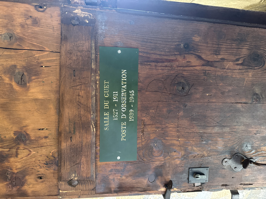 A weathered, dark brown wooden door, constructed from vertical planks with prominent grain and knots, is centrally depicted. The door exhibits extensive surface scratches and faint, carved markings. Located on the upper half of the door is a rectangular, dark green metal plaque with gold-colored sans-serif text. The text reads: "SALLE DU GUET", followed by the dates "1527 - 1911", and then "POSTE D'OBSERVATION", with the dates "1939 - 1945". The plaque is secured by two visible silver screws. On the left side of the door, below the plaque, a modern, rectangular black metal plate with a keyhole for a cylinder lock is affixed. Directly beneath this, an older, ornate black metal lock mechanism is present, with a key inserted and hanging vertically downwards. Additional dark metal latching hardware is visible along the far-left edge of the door. The door is set within what appears to be a lighter-colored wall, visible at the extreme left and right edges of the frame. The location is identified as the North Tower of St. Pierre Cathedral in Geneva, Switzerland, based on the historical context provided by the plaque (Salle du Guet, Guard Room, Observation Post during WWII). No individuals or active interactions are visible in the scene. The lighting is uniform, highlighting the aged texture of the wood and metal components.