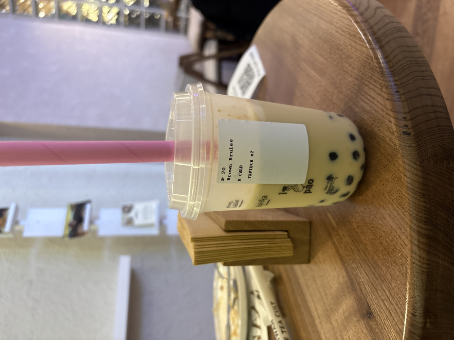 - "A clear plastic cup of Pao Pao Bubble Tea, featuring a pink-and-white striped paper straw, rests on a rounded, light brown wooden table within an establishment identified as a Pao Pao Bubble Tea shop in Chișinău, Moldova" by FM-3pJMh1, licensed under CC BY 4.0