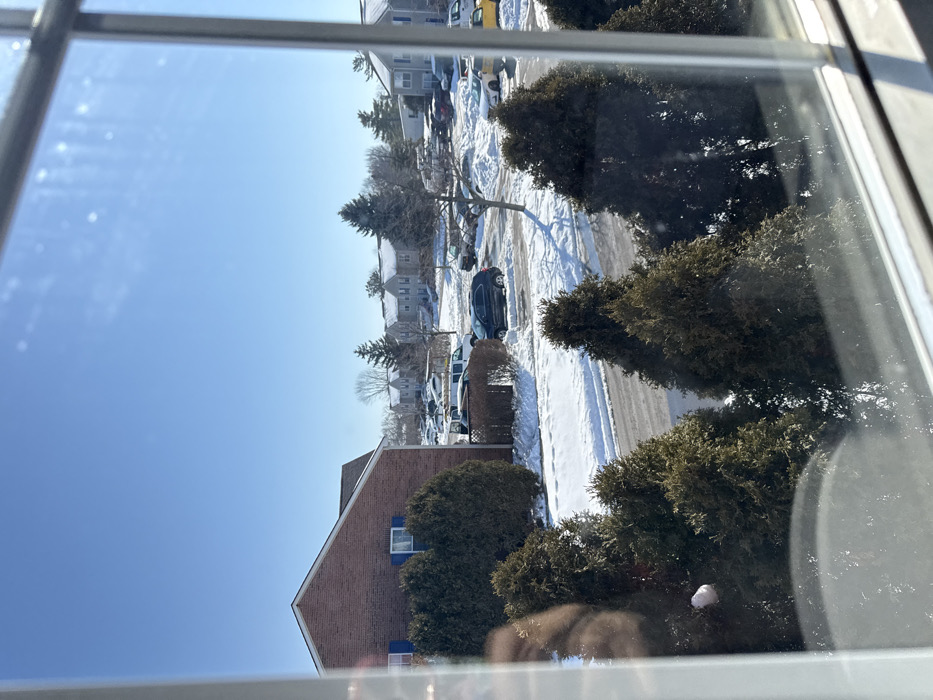 A daytime view through a window shows a snowy residential neighborhood. Buildings with brick and light-colored siding are visible. Several cars are parked along a street, some covered in snow. Evergreen bushes and trees with bare branches line the street. The sky is bright blue, with sunlight glinting off the windowpane. A layer of snow covers the ground and rooftops.