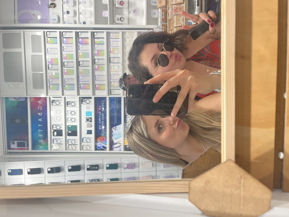 Two women pose for a selfie in a mirror. The woman in the foreground has blonde hair and is pouting her lips. The woman in the background has dark curly hair, is wearing sunglasses, and is making a peace sign. A man is visible in the background standing near phone cases in the store. The mirror is set on a wooden stand.