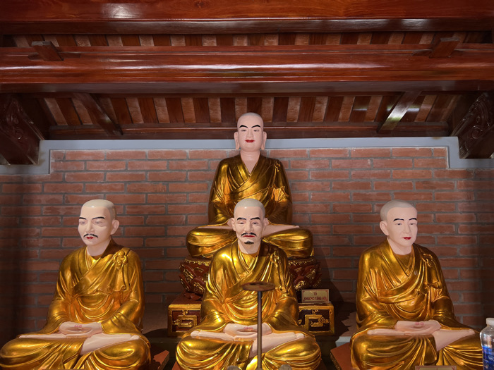 Four golden monk statues sit in a meditative posture. Three are in the front, seated in a row, while one sits elevated behind the middle statue. All the figures wear golden robes, and their heads are shaved. The statues are positioned against a brick wall, and above them, the dark wood of the ceiling structure is visible. The lighting is bright, enhancing the golden hue of the figures.