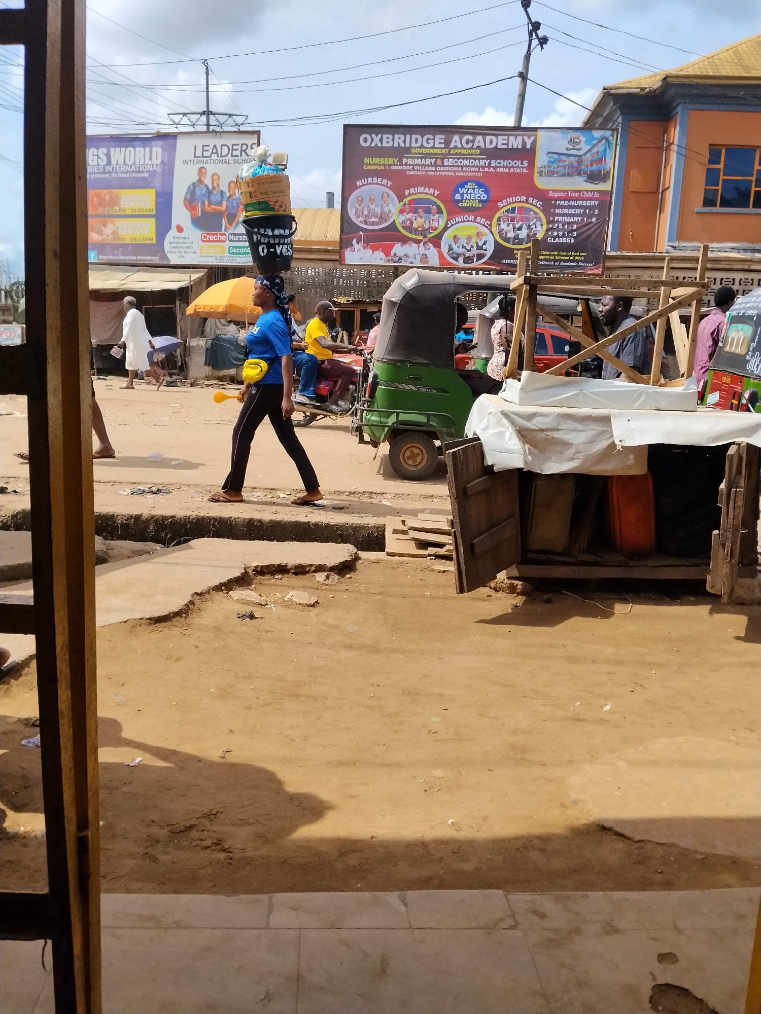 The image depicts a street scene in Umuode, Nigeria. The foreground shows a partly visible wooden structure, possibly a market stall, with open doors revealing containers. A woman is walking towards the left, carrying goods balanced on her head. She wears a blue shirt and dark trousers. A tricycle (auto-rickshaw) is visible in the background. Banners promoting schools, "GS World" and "Oxbridge Academy," are mounted on buildings across the street. Other people are present in the background, including a man on a motorcycle and pedestrians. The ground is primarily dirt, with sections of concrete pavement.