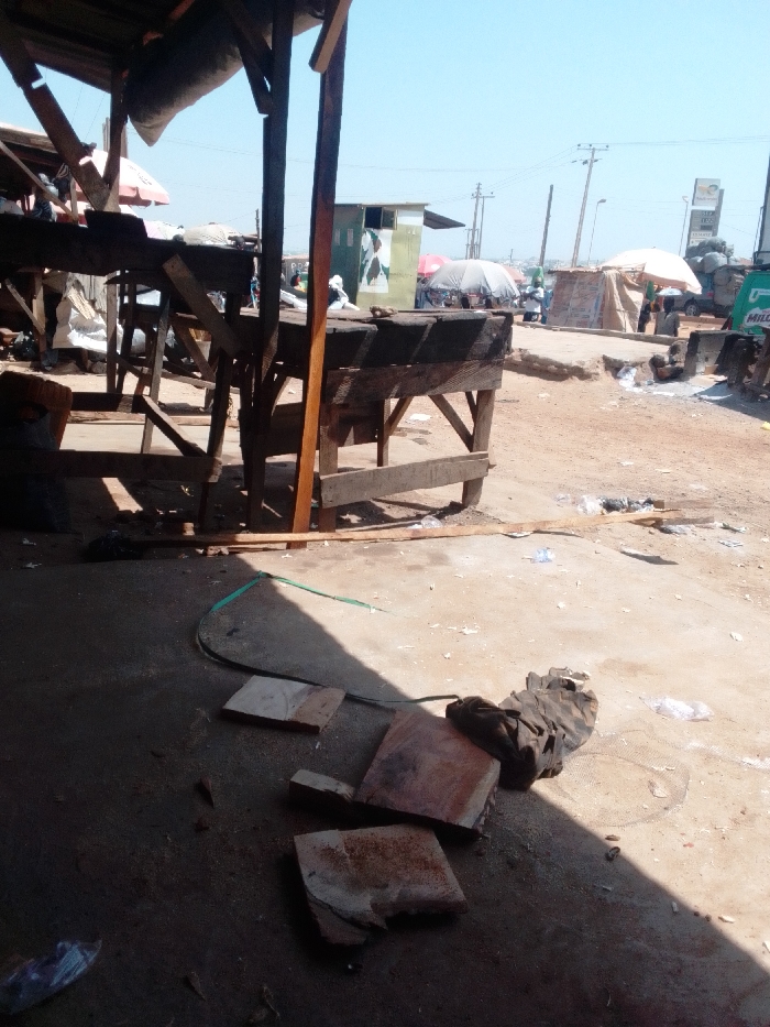 The image displays an outdoor market scene under a clear blue sky, located in the city of 0801712591, Nigeria. The immediate foreground consists of a partially shaded concrete or paved surface, transitioning to a sunlit dirt ground in the mid-ground. Several empty, dark brown wooden market stalls, constructed from rough planks and lacking goods, occupy the left and central foreground. One stall features a dark fabric covering. Scattered debris is visible on the ground, including a coiled green hose, several pieces of light-colored, irregularly shaped material (possibly broken tiles or wood), a crumpled dark fabric object, and various small plastic items. In the mid-ground, a light-green shack with a white graphic is positioned to the left. Further back, numerous indistinct figures of people are present amidst additional market stalls, some covered by large umbrellas (one prominent grey) and tarps. Utility poles with overhead power lines traverse the scene horizontally. On the far right, a partial view of a vehicle, likely a truck, shows the text "MILL" on its side, adjacent to a white tarp-covered structure. A large, partially visible billboard or sign is in the distant background.