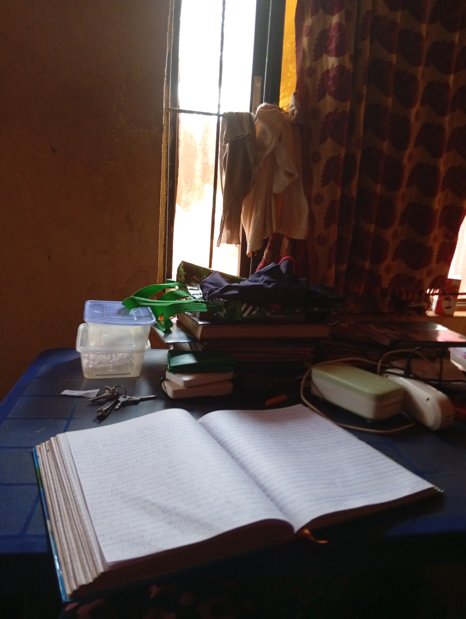 The scene depicts an indoor environment in Nsukka, Nigeria, likely a study or personal room. A dark blue plastic table with a textured surface occupies the foreground and midground. An open notebook, displaying handwritten text on both visible pages, is positioned in the immediate foreground on the table. To its left, a set of metal keys on a key ring rests beside a small, torn piece of white paper. Further back on the table, a stack of two clear plastic containers is visible, the upper one secured with a translucent blue lid. Adjacent to these containers, a green fabric strap is present. Behind these items, a stack of books or binders supports a folded piece of dark blue/purple fabric. To the right, on the table, a light green and white stapler-like object sits next to a white telephone handset, both surrounded by various cables. The background features a window, through which bright daylight is visible, indicating an exterior light source. The window incorporates vertical and horizontal metal bars and is partially covered by a translucent yellow-orange material. To the right of the window, a dark-colored curtain with a repeating maroon floral pattern hangs. To the left of the patterned curtain, near the window, light-colored fabric is draped. The visible wall to the left of the window is a plain light brown or beige. No individuals are present in the image.