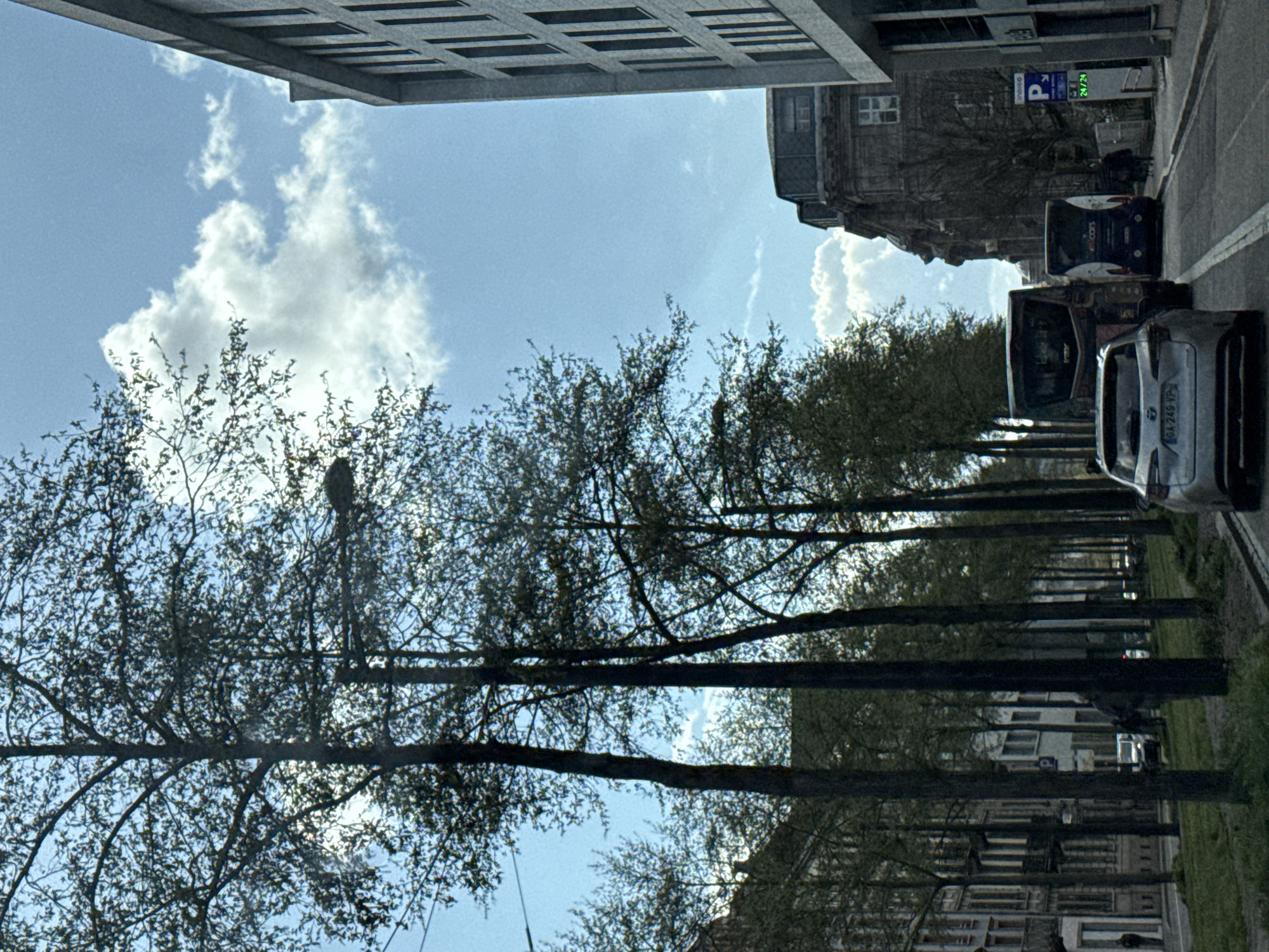 The image depicts an urban street scene in Strasbourg, France, captured during daylight under a partially cloudy blue sky. In the immediate foreground, a silver sport utility vehicle (SUV) with a French license plate "GA-249-VP" is oriented away from the viewer, positioned on a paved road marked with a white double solid line. Ahead and to the left of the SUV, a dark-colored bus with red accents is visible. Further down the road, to the right of the first bus, a second dark-colored bus with the word "ellicars" on its rear is also moving away. A wide, tree-lined median strip separates the road from buildings on the left. Several tall, deciduous trees with nascent green foliage form a prominent line, extending from the mid-ground towards the background on the left side of the frame. A streetlamp is visible within the tree line, suspended over the road. On the left side of the street, multi-story buildings with traditional European architecture, including windows and balconies, are visible in the background. One individual is partially visible near these buildings on the far left. Another individual walks on the grassy median strip in the mid-ground, obscured by trees. On the right side of the image, a modern, grey, multi-story building with vertical window alignments occupies the foreground and mid-ground. Behind it, a large, ornate stone building with a dark mansard roof and multiple windows is visible. On the sidewalk adjacent to the modern building, a blue "INDIGO P 24/24" sign, indicating a 24-hour parking facility, is prominently displayed. Two individuals are walking on the sidewalk near this sign and the second bus.