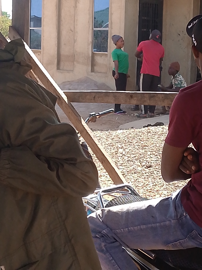 The scene is an outdoor daytime setting in the city of Reifild-Ist, Nigeria. In the immediate foreground, two diagonal wooden planks and a horizontal wooden beam partially obscure the view. To the left, the back of a person wearing a khaki or olive-drab jacket is visible. To the right, a person is seated, wearing a maroon t-shirt, light blue jeans, and a dark baseball cap with white lettering (partially visible, resembling "FXR"). Their arms are crossed on their lap, and a chrome handlebar, likely from a motorcycle or similar vehicle, is visible beneath them. The ground in the mid-ground is covered with small, light-colored gravel. In the background, against an unpainted, concrete building featuring two reflective blue-tinted windows and a dark, possibly metal, doorway, three individuals are present. A female stands on the left, wearing a grey beanie, a green t-shirt, black leggings, and multicolored flip-flops, oriented towards the right. A male stands centrally, facing away from the camera, dressed in a red t-shirt, black track pants with white side stripes, and a dark cap. To the right, a young male is seated on the ground or a low surface, wearing a brown beanie, a camouflage-patterned t-shirt, and dark pants; his right hand appears to be interacting with a surface in front of him. The ground directly in front of the building is bare earth or sand. The scene is illuminated by strong natural sunlight, casting visible shadows.