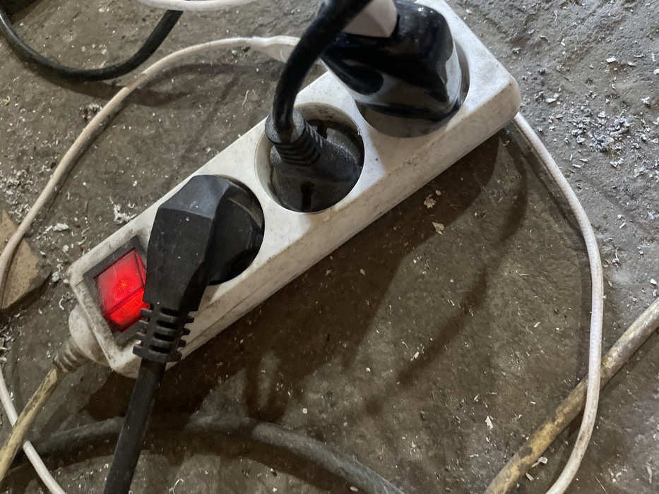 - "A white, three-outlet power strip, featuring an illuminated red power switch, rests on a soiled concrete or asphalt surface" by FM-YBch83, licensed under CC BY 4.0