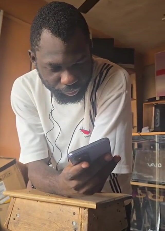 A medium-shot video shows a man with a dark complexion, short black hair, and a beard, wearing a white t-shirt with black stripes on the shoulders. He is leaning on a small, wooden stool, holding a smartphone in his hands, and looking at the screen. He briefly looks up at the camera and speaks. He has earphones connected. The background includes cardboard boxes, a ceiling fan, and electronic equipment on a shelf.