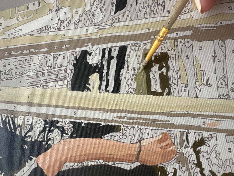 The image presents a close-up view of a partially completed paint-by-numbers canvas