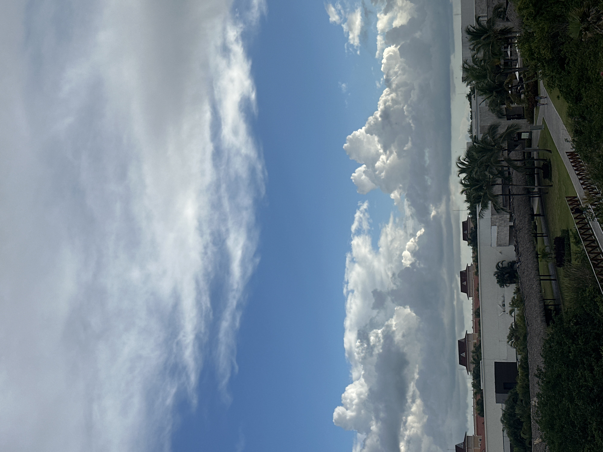 A panoramic view in Higüey, Dominican Republic, depicts an outdoor environment under a partly cloudy sky. The upper sky is light blue with diffuse white clouds, transitioning to a darker blue above a prominent layer of white and grey cumulus clouds extending across the mid-horizon. Below the cloud line, the upper sections of multiple resort buildings are visible, characterized by white exteriors and reddish-brown, pyramidal-style roofs. The foreground and midground feature a meticulously landscaped tropical garden with numerous palm trees and dense green foliage. A paved walkway curves through this terrain, and a long, covered path with a thatched roof extends horizontally across the scene. Two individuals are discernible walking on the paved path, moving away from the viewer. A wooden fence or railing is present in the lower left quadrant.