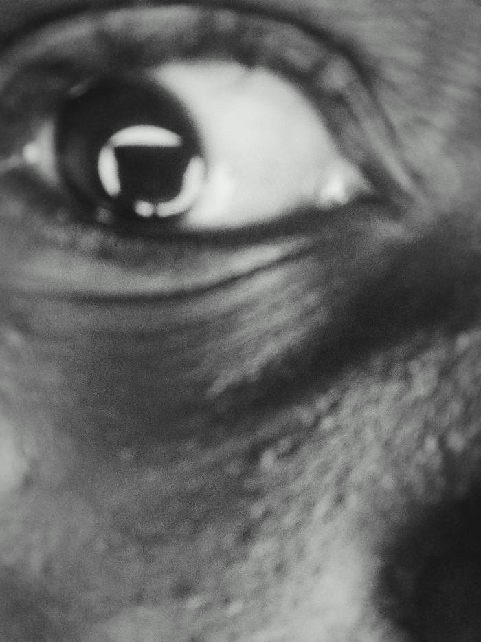 A close-up black and white photograph shows a human eye. The eye is open, with visible reflections in the pupil. Wrinkles and textures of the surrounding skin and tissue are apparent. The image is slightly out of focus, creating a soft, grainy effect. The overall composition is stark and intimate.