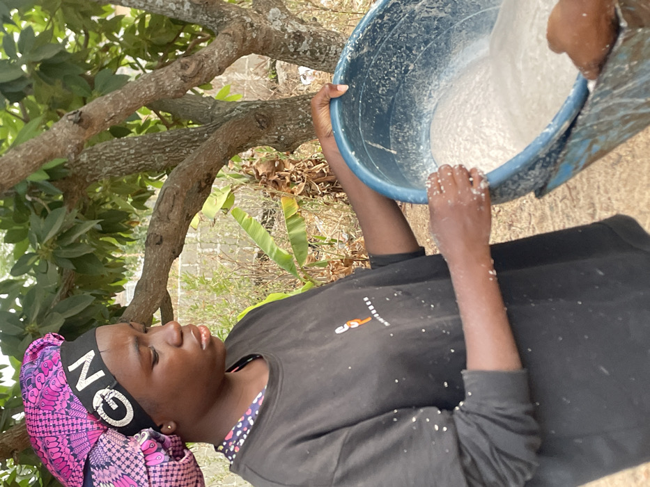 A young adult female is depicted outdoors in Rafin Bauna, Nigeria. She has dark skin and wears a black long-sleeved t-shirt with a small logo on the left chest and a pink and purple patterned head wrap featuring a black band with "GN" in white letters. Her gaze is directed downwards, focused on a large, blue plastic basin she holds with both hands. She is in the process of pouring a frothy, light-colored, granular mixture from this basin into a second container, partially visible at the lower right. White particulate matter from the mixture is visible on her hands and shirt. The background consists of a large tree with green foliage and visible branches, sparse dry vegetation, and a light-colored wall or fence segment. The ground surface appears to be dry earth.