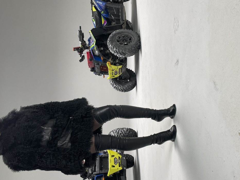 An indoor studio scene features one individual and two All-Terrain Vehicles (ATVs) against a seamless light gray backdrop. The floor is light gray with minor scuffs and faint marks, including tire imprints. One person is partially visible, from approximately the mid-torso to the feet, standing slightly to the left of the frame. This individual is clad in a voluminous, shaggy black coat, cinched at the waist by a black leather corset-style belt with a prominent zipper. Below the coat, they wear form-fitting black thigh-high boots with distinctive, sculptural heels. The person stands still, facing slightly right. Two ATVs are present. The ATV on the left is partially visible, showing its front section, which is blue and black with bright yellow elements on the bumper and grille. The ATV on the right is more fully visible, positioned further back and to the right. It is blue, black, and red with yellow accents on the front bumper. This ATV, identifiable as a Polaris Scrambler model, features knobby tires showing traces of dirt. A red container is secured to its front rack, and a mobile device is mounted on the handlebars. The specific location within the City of Zagreb, Croatia, is unidentifiable from the studio setting depicted.