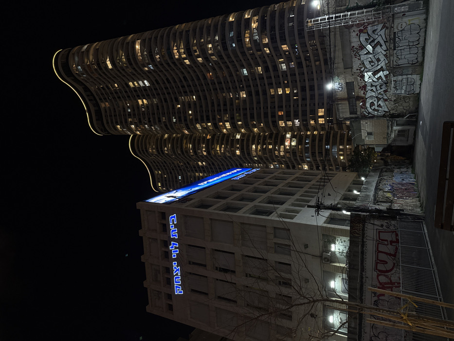 The image depicts an urban nighttime scene in Tel-Aviv, Israel