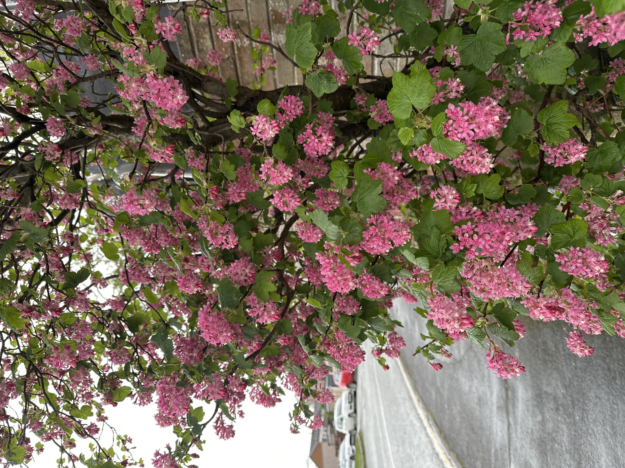 The image depicts a vibrant pink-flowered shrub or small tree dominating the foreground and mid-ground. The plant exhibits dense clusters of small, five-petalled pink flowers, many still in a bud stage, interspersed with dark green, lobed leaves. Water droplets are visible on the foliage. The tree's brown, gnarled trunk and branches are discernible through the dense blossoms. To the left, a wet, dark grey asphalt road recedes into the background, featuring a faint yellow line along its left edge. Three passenger vehicles are visible in the distance: a white sedan, a white hatchback, and a red hatchback. Beyond the vehicles, residential structures, possibly brick-built, are partially visible. The sky is uniformly overcast and light grey. To the right, behind the flowering plant, a textured wall composed of light brown/tan horizontal bricks is partially exposed. No individuals or direct interactions are visible. The wet surfaces indicate recent precipitation. This scene is situated within a residential area of Macclesfield, United Kingdom; however, a specific street address cannot be determined from the visual information provided.
