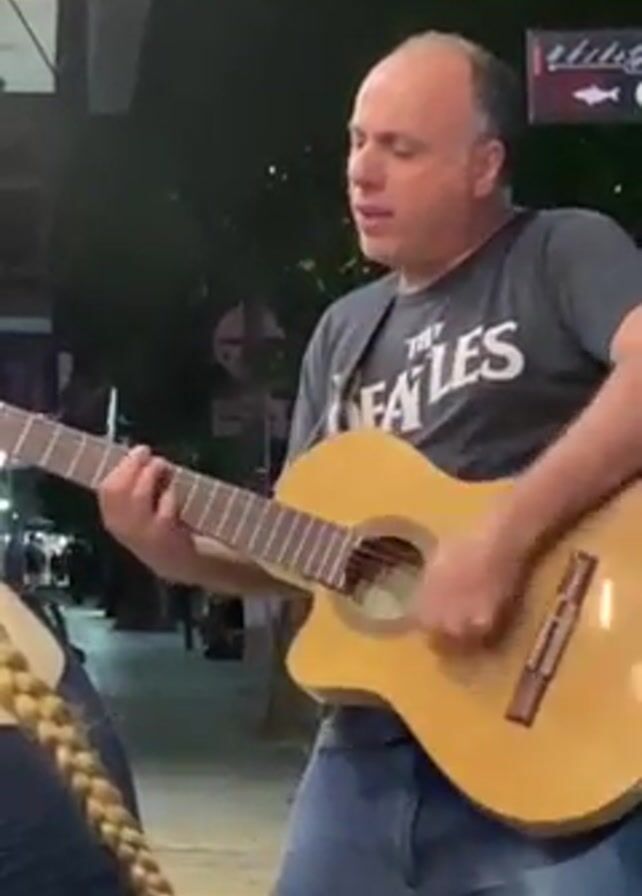 A man plays an acoustic guitar and sings. He’s wearing a gray t-shirt with “THE BEATLES” printed on it, and blue jeans. He is bald on top of his head. He’s playing on a city street at night. A pole is behind him, with street sign, showing a fish. Someone with long braids is sitting in front of him.