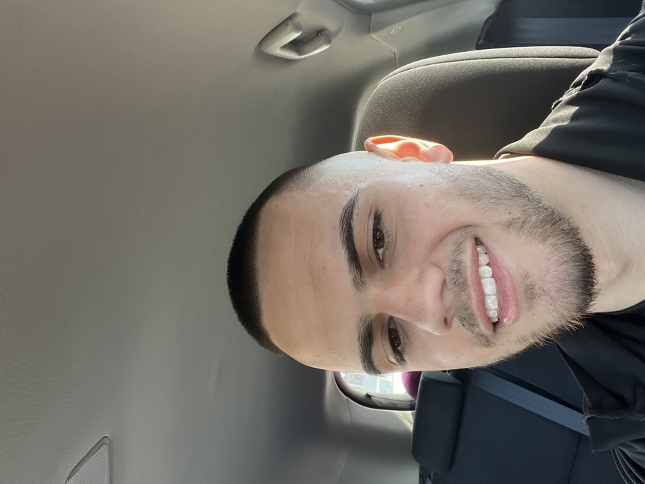 The image depicts a male individual seated inside a vehicle, location Unknown, Unknown. The individual is a young adult with light-to-medium skin tone, dark brown eyes, thick dark eyebrows, and a neatly trimmed dark beard and mustache. His hair is cut very short in a buzz cut style. He is smiling, revealing white teeth, and looking directly towards the camera. He is wearing a dark-colored garment, possibly a shirt or jacket. The interior of the vehicle is visible, featuring a light grey headliner, a light grey grab handle on the upper right, and dark grey/black seats. A dark seatbelt is visible on the far left side of the frame, indicating the presence of a rear seat. Natural light illuminates the scene, particularly from the subject's right side.