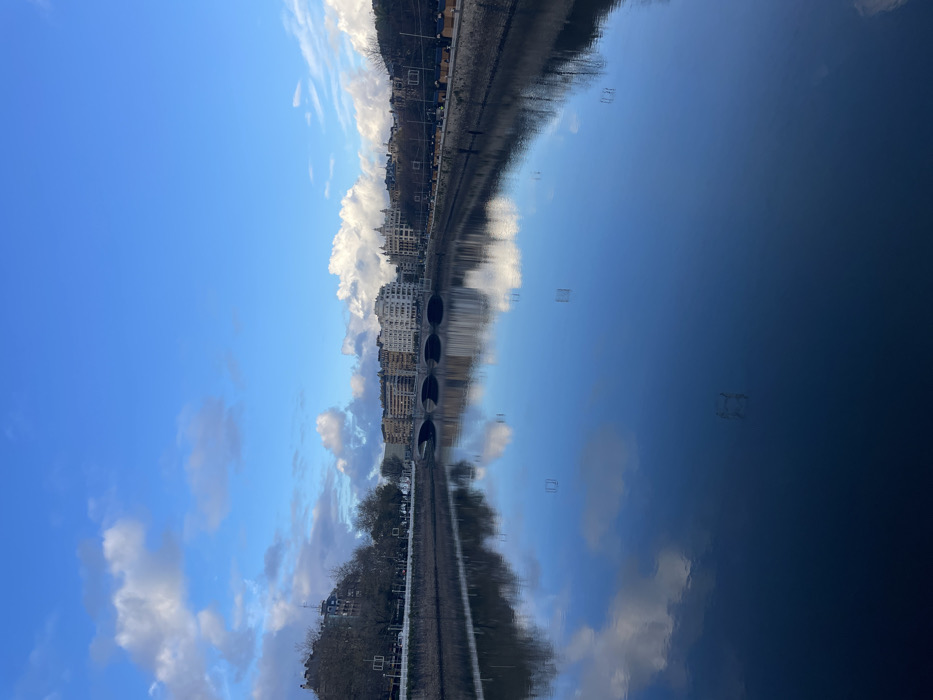 A serene scene depicts a body of water reflecting the sky, clouds, and buildings. A bridge with prominent arches is visible, mirroring in the water below. Buildings line the waterfront, their forms reflected in the calm surface. The sky is a mix of blue and white clouds, also mirrored in the water, creating a symmetrical and visually appealing composition. The overall tone is peaceful and reflective.