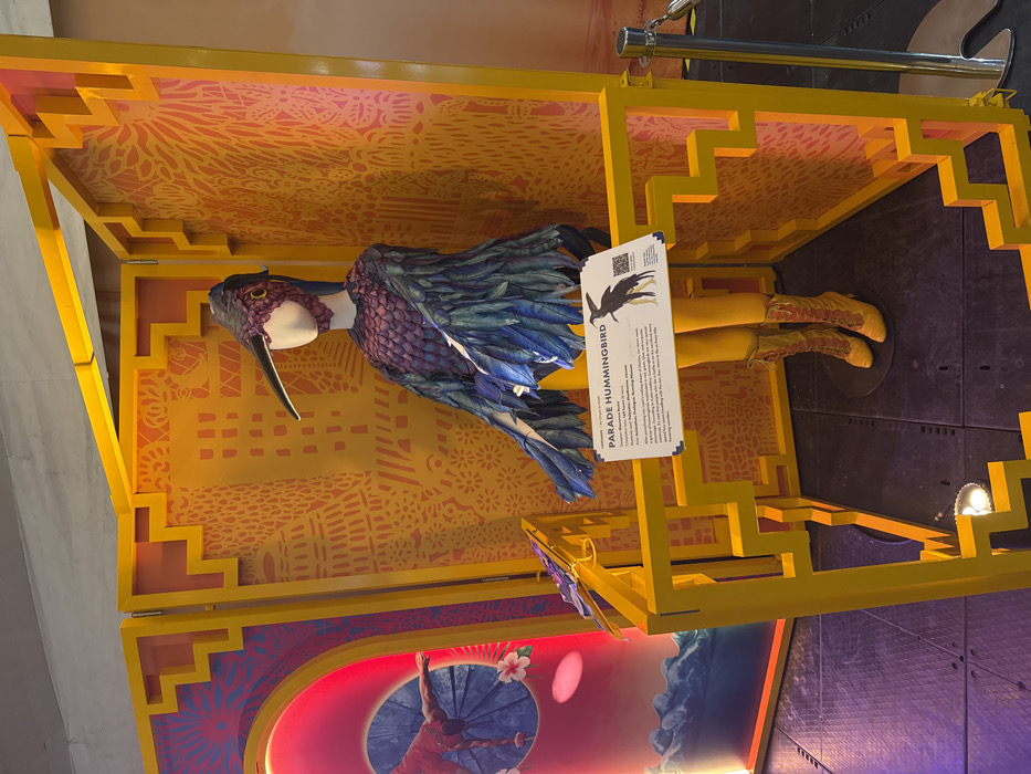 An indoor exhibition display is observed in Hallandale Beach, United States of America. A stylized mannequin, positioned on a dark gray patterned floor, wears a "Parade Hummingbird" costume. The costume includes a textured purplish-red and blue mask with a prominent, elongated black beak, a chest and shoulder piece composed of layered, iridescent blue, green, and purple feather-like elements forming wings, bright yellow full-length leg coverings, and yellow lace-up boots with brown laces and soles. The mannequin is enclosed within a bright yellow, modular display structure featuring stepped geometric patterns. The background panels within this enclosure are orange with intricate, lighter orange patterned designs. A white rectangular sign, approximately 30x20 cm, labeled "PARADE HUMMINGBIRD," is affixed to the front yellow rail, providing descriptive text, a hummingbird illustration, and a QR code. To the left, a partial view of an adjacent display shows a red-arched structure with a brightly lit graphic depicting a red figure against a blue umbrella and white flowers. A silver stanchion with a retractable barrier chain is partially visible on the right side of the primary display.