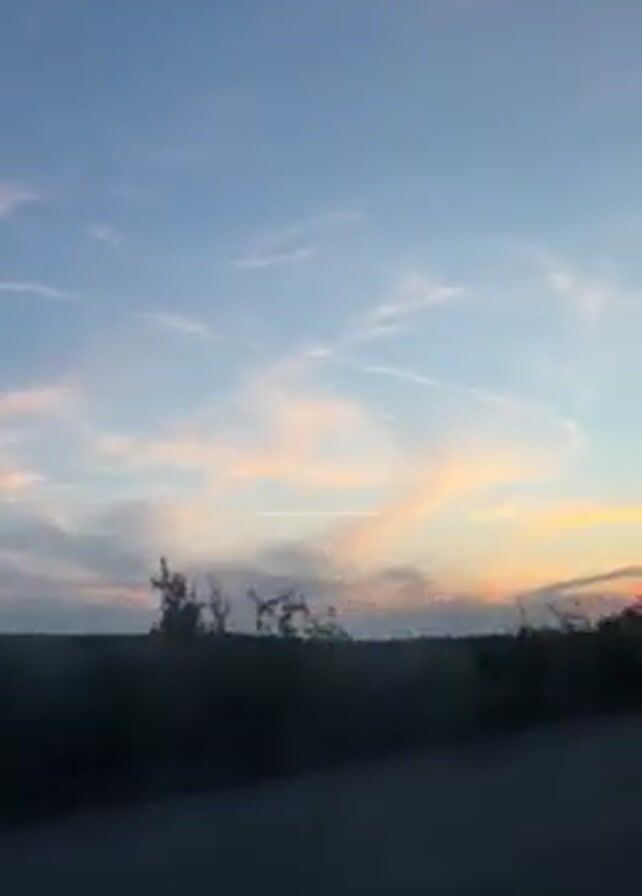 The video is taken from a moving vehicle driving down a road. The road is gray and appears to be paved. The vehicle is moving past a dark, low-lying landscape of trees and shrubs. The sky is blue with streaks of white and pink clouds, indicating either sunrise or sunset. A voice can be heard in the background, possibly speaking Russian. The overall scene is peaceful and serene.