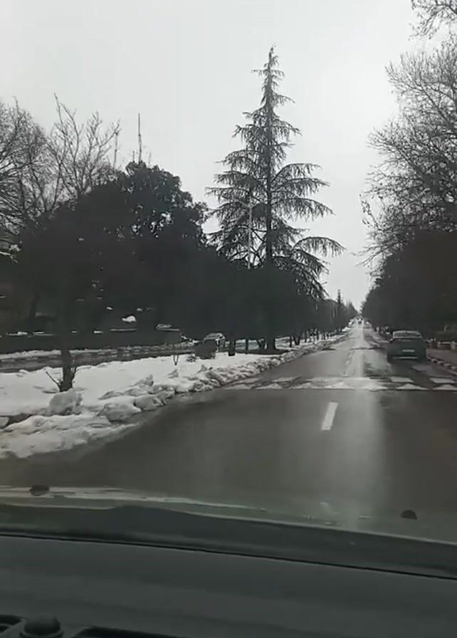 view from inside a car driving down a wet road lined with trees. Some snow remains on the grassy areas beside the road. The sky is overcast. Streetlights are visible along the road. No people are visible outside of the vehicle. The overall scene is gray and somber. The music plays as the car continues down the road.