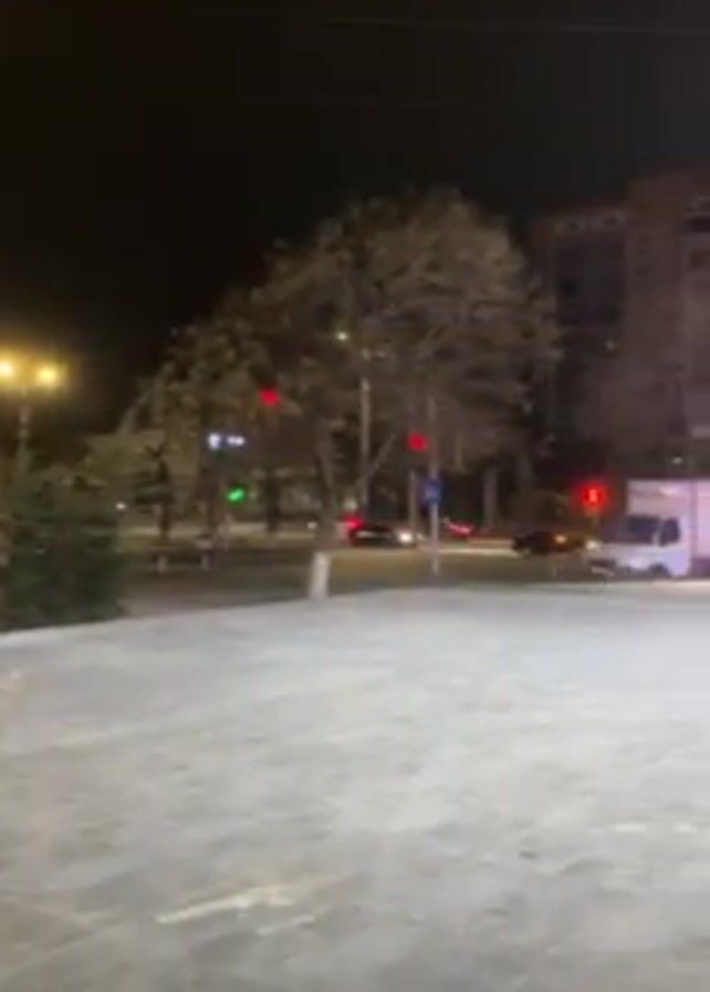 nighttime street scene, possibly in a city. The camera slowly pans across a gray stone walkway toward a modern building with large glass windows. Behind the building, there are trees and other buildings, illuminated by streetlights. A white van is parked near a traffic light in the background. The overall impression is one of urban tranquility at night.