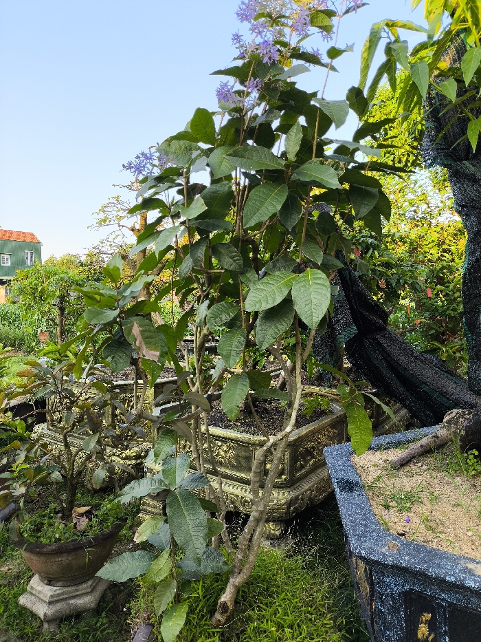 The image depicts an outdoor garden scene in Thành phố Quảng Ngãi, Vietnam, under clear blue daylight. The central subject is a multi-stemmed plant with numerous ovate green leaves and clusters of small, pale purple flowers, potted in a large, ornate square container featuring gold relief patterns against a dark background. To the immediate left, a smaller plant with reddish-green leaves resides in a dark brown round pot resting on a grey octagonal pedestal. Further left, a two-story building with green siding, white-framed windows, and an orange tiled roof is visible in the distance, partially obscured by other green foliage. To the right of the central plant, a large tree trunk or branch, partially wrapped in a dark mesh material, rises vertically. In the lower right foreground, a section of another rectangular planter with a textured dark grey and blue finish, containing sandy soil, is visible. The ground beneath the pots is covered with green grass and some exposed soil. No people or active interactions are present in the frame.