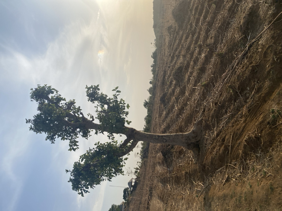 A single tree with green leaves stands on arid land, its trunk angled toward the sky. The terrain is dry and plowed, with remnants of dried vegetation. The sky is pale blue fading into a bright, hazy yellow near the horizon. A faint rainbow-like halo is visible near the top of the sky. A small, dark structure is visible in the distance near the tree's base.