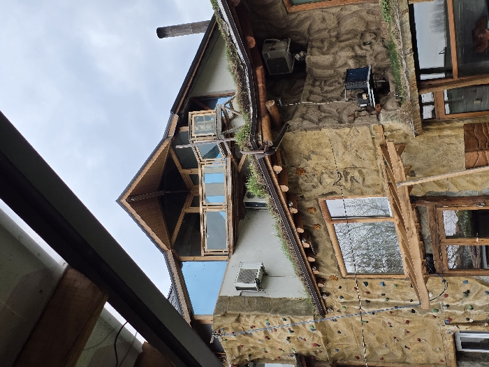 A multi-story building in Slokoshtitsa, Bulgaria, is depicted under an overcast sky, partially framed in the upper left by a dark beam and white gutter from an unseen foreground structure. The building displays an eclectic architectural style. The lower and mid-levels feature a textured, rock-like facade with integrated elements. An outdoor climbing wall, equipped with numerous multi-colored holds, is prominent on the left side of the lower facade. Multiple rectangular windows with wooden frames are visible, reflecting ambient light and distant vegetation. A "green roof," covered with live vegetation, spans the mid-level, bordered by rustic wooden eaves and gutters. Several external air conditioning units are mounted on the building's walls at various heights. The upper section consists of a lighter-colored plastered facade, topped by a dark-shingled pitched roof. An open-air balcony with glass and wood railings is situated on this upper level, partially covered by an angular, open-frame wooden roof structure. A slender, dark metal chimney stack extends upwards from the right side of the main roof. No individuals or explicit actions are present within the frame.