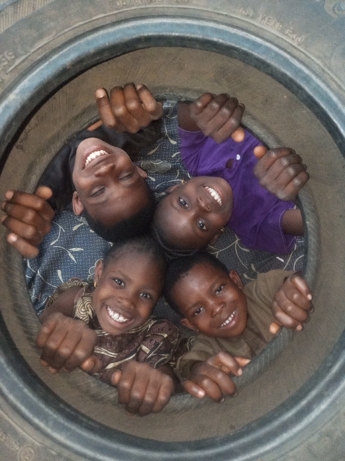 - "Four children, smiling and looking upwards, are nestled inside a large, gray tire" by FM-l9iEo2, licensed under CC BY 4.0