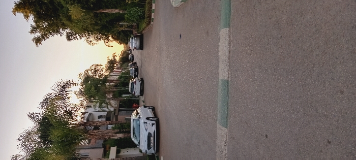 The image displays a quiet residential street in Fez, Morocco, captured during what appears to be either sunrise or sunset, indicated by a sky transitioning from a pale orange-yellow horizon to light grey overhead. The asphalt road surface, flecked with lighter aggregate, extends into the background. A green and white painted curb borders the road in the foreground. No individuals are visible within the scene. Several vehicles are parked along the street. In the foreground on the left, a white Ford Focus hatchback is parked parallel to the curb, displaying a Moroccan license plate with the digits "67371". Further down the street on the left, a silver or light-colored hatchback is parked. On the right side of the street, a dark-colored sedan is parked parallel to the curb. Additional vehicles, including cars of various colors, are visible further in the distance. The street is flanked by numerous tall palm trees, predominantly on the left side, and dense green vegetation consisting of hedges and smaller trees along both sides. Modern, multi-story residential buildings with light-colored facades and visible windows are situated behind walls or fences on the left side of the road. A circular manhole cover is present on the road surface in the mid-ground. No specific actions or interactions are taking place.