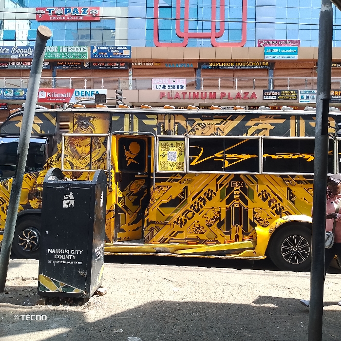 The image depicts a vibrant street scene in Nairobi, Kenya, specifically in front of Platinum Plaza. The central subject is a customized public service minibus, commonly known as a "matatu," adorned with intricate yellow and black graffiti-style artwork. The artwork features a stylized female face with dreadlocks on the mid-section, geometric patterns, text, and a visible QR code on a window panel. The matatu's wheels have multi-spoke silver and black rims. In the background, a multi-story commercial building identified by a large "PLATINUM PLAZA" sign is visible, featuring a blue glass facade and numerous smaller shop signs including "TOPAZ DRIVING COLLEGE," "Kilimall," "DENFA," "SUPERIOR HOUSEHOLDS," and "PRINTING HUB." In the foreground, to the left of the matatu, stands a black waste bin with "NAIROBI CITY COUNTY" text and a garbage disposal graphic. Shadows are cast across the paved ground, indicating daytime. A partial figure of a person wearing a light-colored shirt and carrying a bag is visible on the right side of the frame, walking past the matatu. Another person's head is partially obscured behind the trash bin on the left. Two vertical, dark poles frame the scene on the left and right.