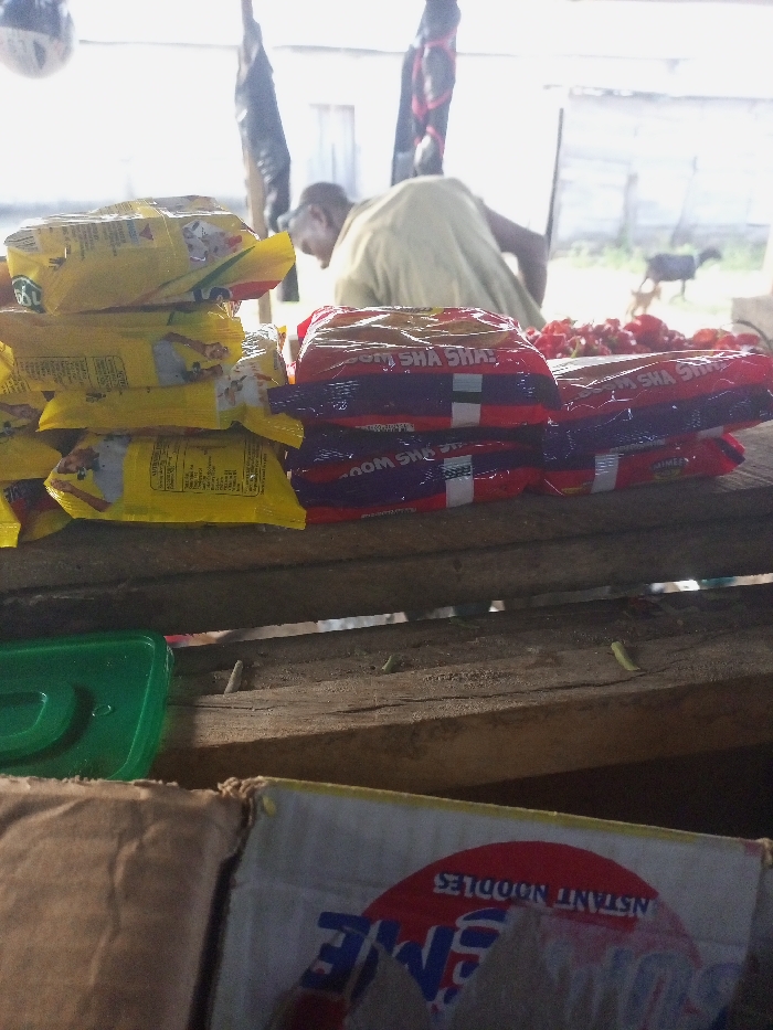 This image depicts a market stall in the city of Unknown, Unknown. In the immediate foreground, a brown cardboard box, partially inverted, displays "INDOMIE INSTANT NOODLES" text. Above this, a green plastic container with a lid rests on a rough wooden plank surface. Further along the wooden surface, in the midground, are two distinct stacks of packaged goods: one stack comprises yellow-packaged items (partially labeled "BIGG..."), and an adjacent stack features red and purple packages clearly labeled "BOOM SHA SHA." In the background, an individual, appearing to be an older adult, is bent over with their back to the camera, wearing light-colored clothing, engaged in an unseen action, possibly arranging goods. To the individual's right, a quantity of red produce, consistent with chili peppers or tomatoes, is piled on a surface. The background also reveals an outdoor environment with sparse vegetation and a dark quadrupedal animal, possibly a goat or dog, in the distance. Dark, elongated objects are suspended from overhead structures. The scene is illuminated by natural daylight.