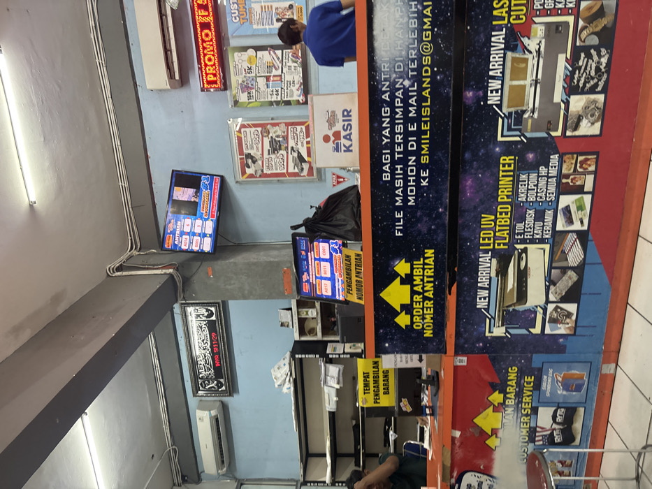 interior of a print shop. Various signs advertise services like "NEW ARRIVAL LED UV FLATBED PRINTER" and "NEW ARRIVAL LASER CUT." Displays show waiting numbers for customer service, indicated as A014, B006, C003. Other signs direct customers to order or pick up their order. A television and framed scripture hang on the wall. Promotional posters advertise pricing for specific products like custom tumblers. A sign requests customers to submit print files via email.