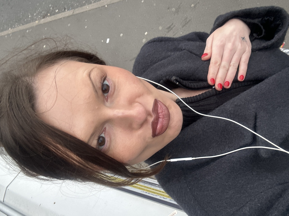 A female individual is depicted in a medium-close-up, selfie-style photograph, facing the camera with a slight downward angle. She has dark brown hair, brown eyes, and appears to have a fair-to-medium skin tone. Her lips are made up with a dark reddish-brown lipstick, overdrawn, and formed into a pout expression. She wears a dark grey or black woolen coat over a dark, ribbed top. White wired earphones are draped around her neck, with the headphone jack visible against her clothing on the left side of her chest. Her left hand rests on her upper chest, displaying bright red painted fingernails. A small, dark star tattoo is visible on the inner side of her left wrist. The background on the left features a portion of a light-colored, possibly white, vertical structure with visible vertical yellow and dark stripes. To the right and behind the subject, a grey paved surface, consistent with a road or sidewalk, is visible, containing scattered small, light-colored specks. The scene appears to be outdoors under diffuse lighting. This scene is located in the city of Uttlesford, United Kingdom.