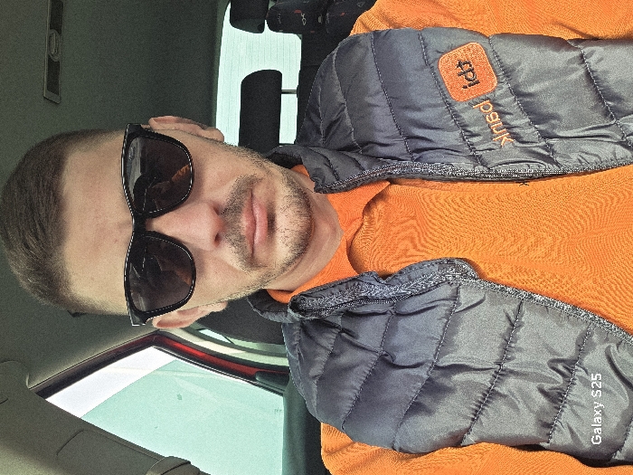 An adult male is depicted in a close-up, front-facing portrait, seated within a vehicle. The location is specified as Novo Delchevo, Bulgaria. The subject has short, dark hair, a trimmed beard, and a mustache. He wears dark, rectangular sunglasses. His attire consists of a vibrant orange collared shirt and a dark grey quilted puffer vest. An orange patch on the subject's right side of the vest displays white text, which includes "idt" and a seemingly mirrored word such as "kirnd". The interior of the vehicle is partially visible, showing a red door frame on the left, a dark-colored seat headrest behind the subject, and a light-colored ceiling. Distant, bright, and indistinct outdoor views are visible through the vehicle's windows. The image features a "Galaxy S25" watermark in the lower-left corner.