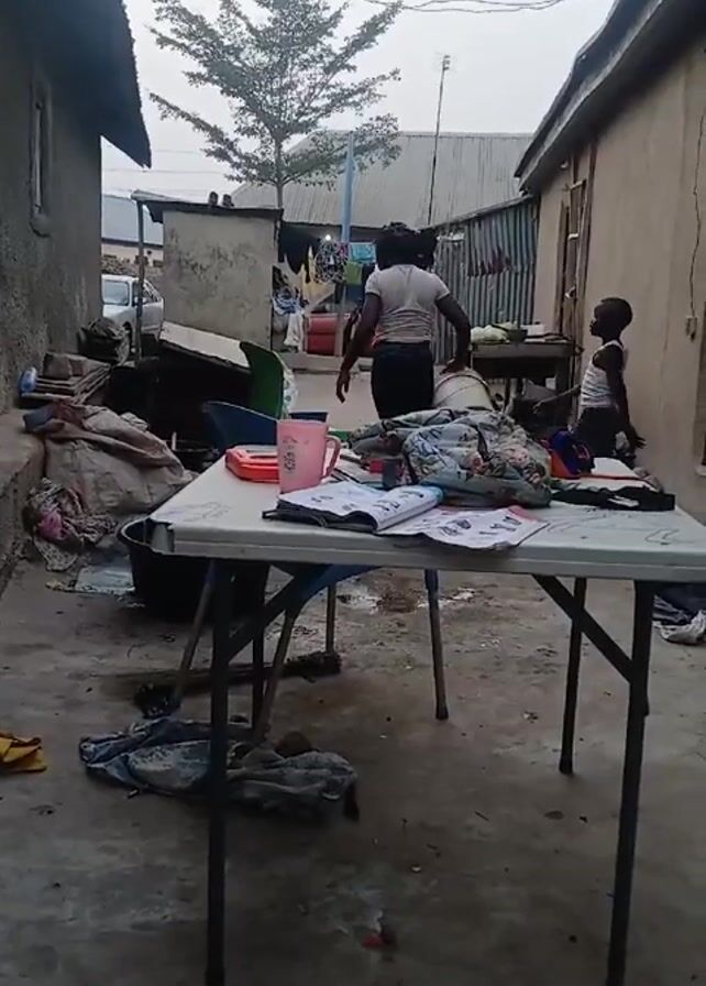woman and two children in what appears to be a narrow outdoor space between buildings. The space has a concrete floor and is cluttered with various items, including clothes, buckets, and miscellaneous debris. A white folding table is in the foreground, covered with a notebook, clothing, and other objects. The woman walks up to the table carrying a white object and begins to clean it. One child stands near the table while the other child stands near a doorway to the right. Clothing is hung on a clothesline in the background between two buildings. A tree is visible behind the buildings. The overall scene suggests a modest living environment.