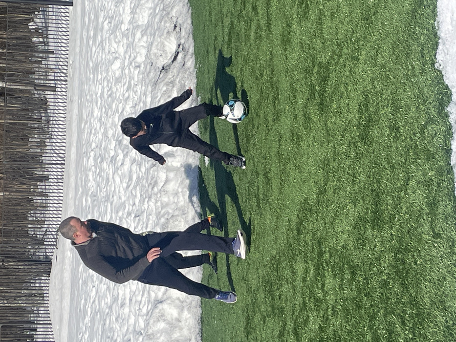 The image captures an outdoor scene in Kommunarka, Russia, on a sunny day. Two primary figures, an adult male and a child, are present on a green artificial turf field. The adult male, with short grey hair and wearing a dark zippered jacket, dark pants, and athletic shoes, stands slightly bent, observing the child. The child, dressed in an all-black tracksuit and dark athletic shoes, is positioned with a white and blue soccer ball at his feet, appearing to control or move it. The lower legs and feet of a third individual, wearing dark pants and athletic shoes with orange accents, are partially visible behind the adult. Beyond the green turf, a significant layer of white snow covers the ground, extending to a dark metal fence. Behind the fence, bare trees are visible under a bright sky. Distinct shadows are cast on the turf, indicating strong sunlight, consistent with a late winter or early spring setting.