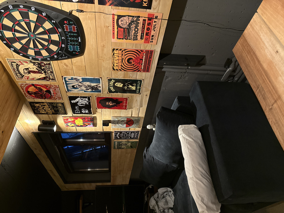 This image depicts an interior room in the city of Podgumer, Bulgaria, furnished as a recreation or lounge area. The upper section of the walls is clad in horizontal light-colored wood paneling, while the lower section is a dark gray, textured surface, possibly concrete. A horizontal window, framed in dark material, is centered on the wooden wall section, looking out into a dark, unidentifiable exterior. Above the window, a black cylindrical light fixture with two light sources is mounted on the wooden paneling. The wooden wall is extensively decorated with numerous vintage-style metal or tin signs featuring prominent musical artists and concert posters, including "ROCK & ROLL," Elvis Presley, Jimi Hendrix, Bob Marley ("ONE LOVE"), Stevie Wonder, James Brown, Alice Cooper, and other band imagery. An electronic dartboard with a black frame and multi-colored segments is mounted on the wooden wall to the right. A black power cable descends from the dartboard. In the foreground, a dark gray or black sectional sofa occupies the lower-left portion of the scene. Multiple matching cushions are present, along with a white bolster pillow or rolled-up blanket resting on the sofa. A light gray crumpled fabric, possibly a blanket or clothing, is draped over the sofa's left armrest. A small, light-colored decorative object or figurine is perched on the back of the sofa, near the wall. Partially visible in the bottom-right corner is a wooden surface, likely a coffee table. Light gray pipes run vertically and horizontally along the dark gray wall section, behind the sofa and adjacent to the wooden table. No people are present, and no specific actions or interactions are depicted.