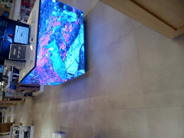 A modern retail space presents a striking display of technology. A large, multifaceted screen showcases vibrant aquatic imagery, possibly an aquarium scene. Various electronic devices sit on a light-colored counter beneath the screen, possibly for demonstration. The surrounding floor is composed of large, neutral-toned tiles. A wooden structure borders one edge of the floor, adding a touch of warmth. The overall scene creates a sleek and technologically advanced atmosphere.